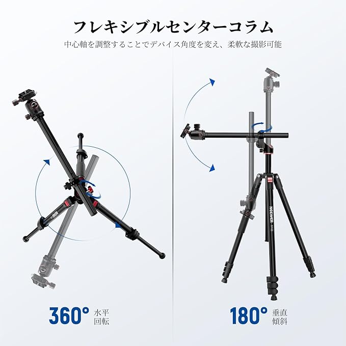 【多彩なセットアップとフレキシブルなセンターコラム】カメラ三脚は、高さを調整できるセンターコラムを搭載しており、高い撮影アングルが必要な場合は上げ/下げできます。水平方向には360 回転、垂直方向には120 チルトが可能です。ボールヘッドを装着すれば、360 パノラマ撮影や様々なアングルでの撮影にも対応します。コンテンツクリエイターやインフルエンサーにとって、ローアングル撮影、スポーツ写真、結婚式、旅行、Vlog、都市風景撮影など、必要なツールです。