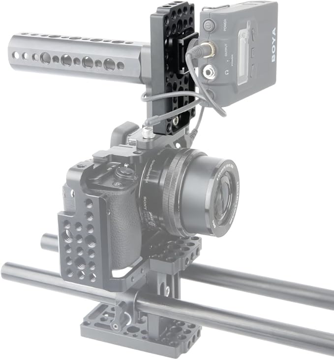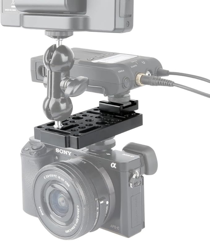 【広い範囲を使用ができる】連続プレートは1/4インチのネジ穴、3/8インチのネジ穴、M3ネジ穴 、M4ネジ穴、1/4インチのシンクホールが付いて、複数ネジ穴の設計なので、ロッド、 アーム、バッテリ、コンバータボックス等様々なカメラアクセサリーを装着可能です。(ネジ穴間隔は9mmので、もっとシンプルと直観に利用ことができます。)汎用性だけで無く安定性、機能性にも優れています。用途に合わせ調整できます。プロやアマチュアを問わず、カメラマン/映画製作者のための適当な機材です。