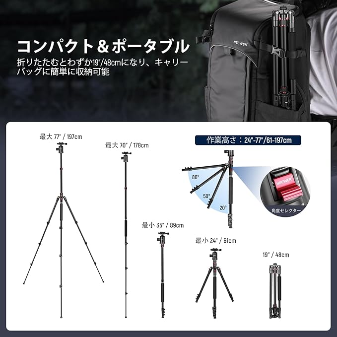 NEEWER カメラ三脚一脚 197cm ビデオ三脚 アルミ製 コンパクト 軽量 トラベルスタンド 旅行三脚 折りたたみ式 ポータブル 撮影用三脚 ボールヘッド/QRプレート/バッグ/スマホホルダー/クリーニングクロス付き コンパチブル iPhone ビデオ録画用 耐荷重15.4kg TP77