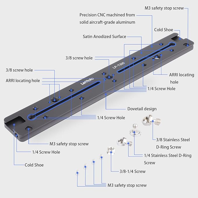 LEFTFOTO 300mmアリ溝スライドレール、アルカスイスタイプクイックリリースプレート ARRI用位置決め穴付き 1/4 "ネジ穴、3/8 "ネジ穴、コールドシュー付き