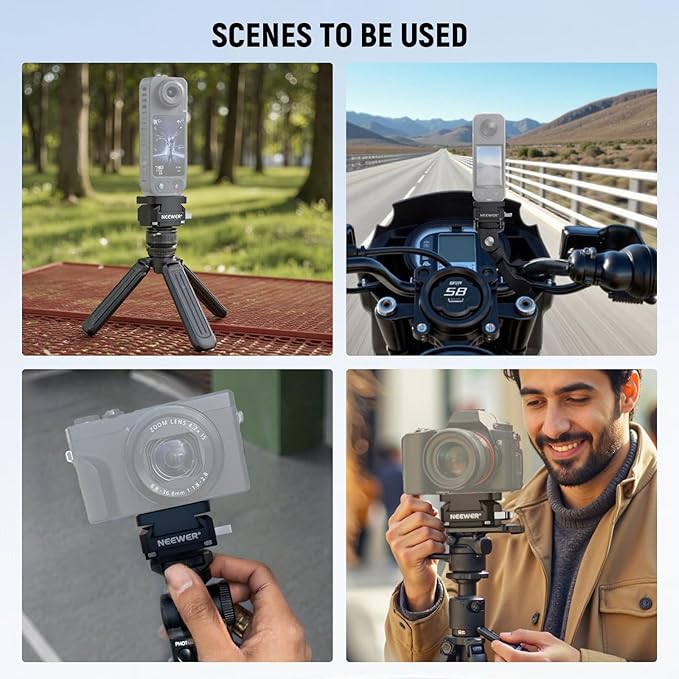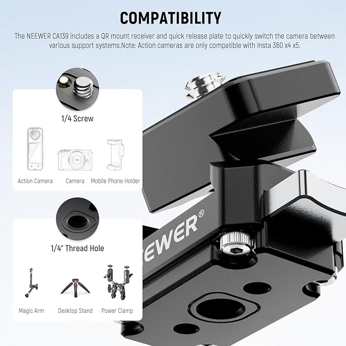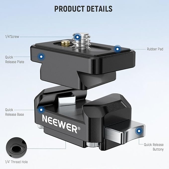 【クイックリリースアダプターマウント】NEEWER CA139は、QRベースレシーバーとプレートが付属しており、カメラを様々なサポートシステム間で素早く切り替えられます。ベースをブラケットに固定し、プレートをカメラに取り付けたら、プレートをベースにスライドさせるだけで、カメラを素早く着脱できます。