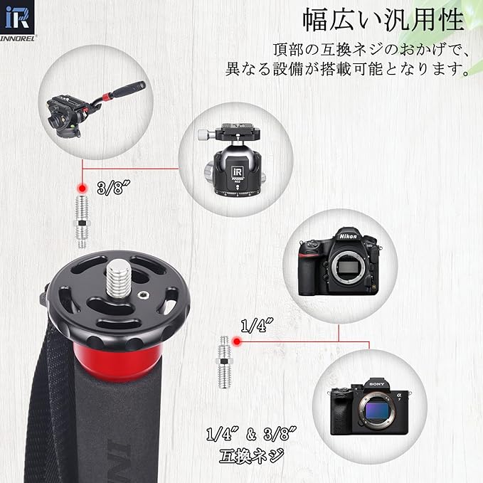 【幅広い汎用性】アレンキーを使って、頂部の取付パンを外して、取付ネジを1/4”と3/8”二種類のサイズに変更できます。直接にカメラ、スマホクリップ、双眼鏡と取付けても、それとも雲台などの固定設備を装着しても、どちらでも対応できます。