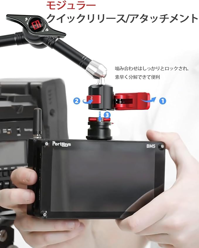 【クイックリリースアーム】両端のクイックリリースアダプターは、開いて押し、デバイスを回転させることなく、2つのステップでリリースすることができます