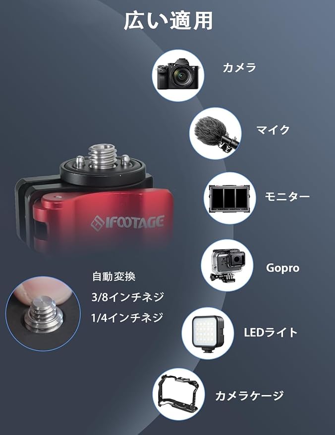 【幅広い用途】両端の1/4 & 3/8コンバーチブルスクリューとシューアダプターにより、ライト、モニター、カメラ、マイクをCクランプ、吸盤、三脚、一脚に簡単に取り付けることができます