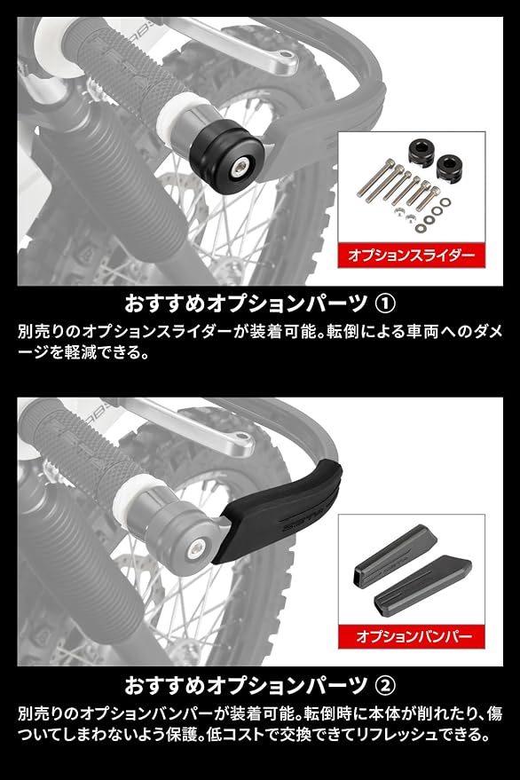 別売りのハンドプロテクターを幅広くラインナップ。泥や木の枝はもちろん雨風を防ぐなど、用途に合わせて豊富なバリエーションを設定。
