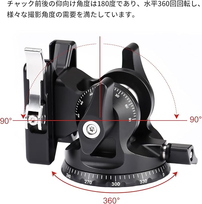 ✪チャック前後の仰向け角度は180度であり、水平360回回転し、様々な撮影角度の需要を満たしています。