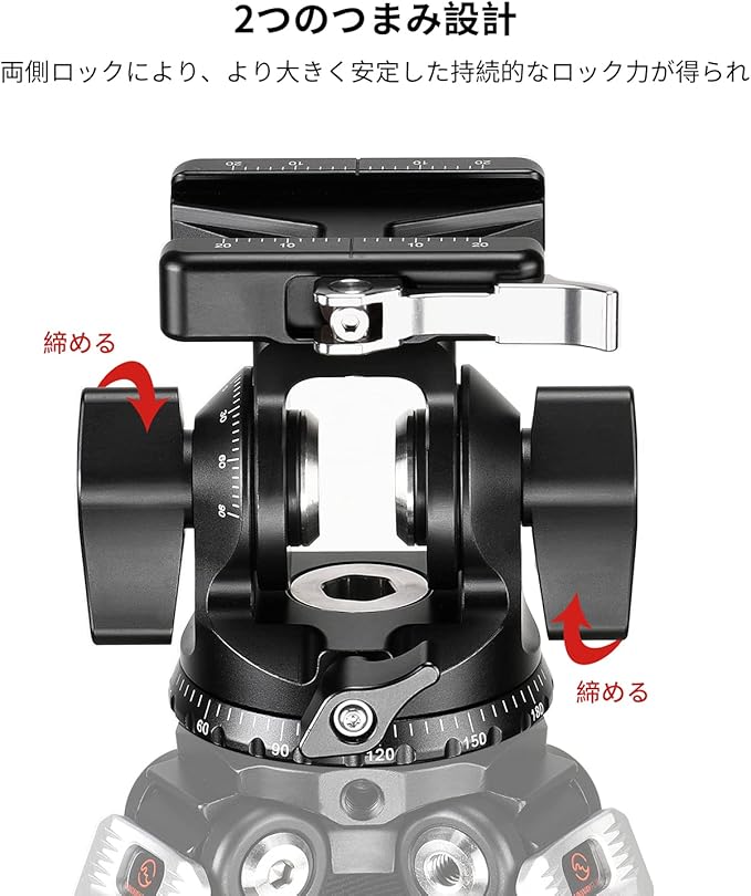 ✪左右両側の二重回転ロックは、片側ロックと両側ロックも可能であり、操作が便利です。両側ロックにより、より大きく安定した持続的なロック力が得られ、雲台の左右両側の力を均衡させ、雲台の使用寿命を延長することができます。