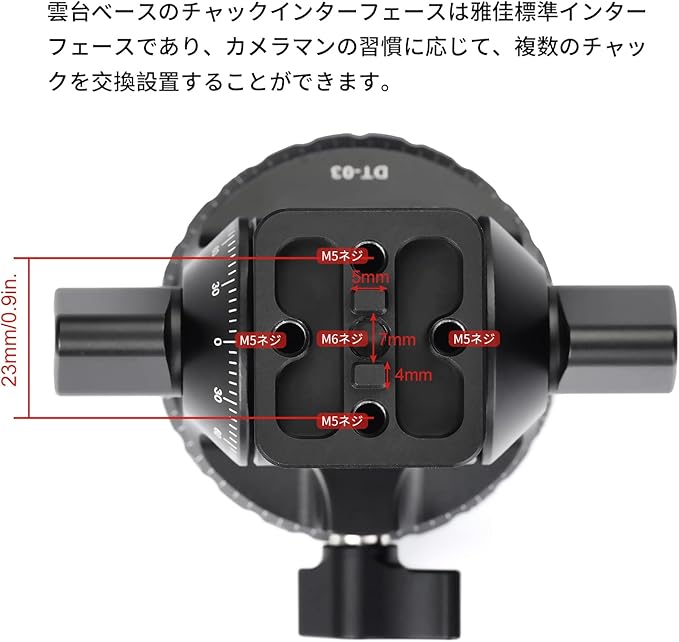 ✪雲台ベースのチャックインターフェースは雅佳標準インターフェースであり、カメラマンの習慣に応じて、複数のチャックを交換設置することができます。