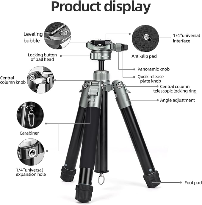 人間工学に基づいたデザイン: 速いロックの設計を使うと、1 秒のカメラの三脚を広げることができます。より快適なグリップのための滑り止めのグリップが付いている足。登山バックルのホックによって装備されていて、三脚をより安定したようにする風の強い天候のカウンター ウェイトを高めるためにあなたのバックパックでそれを掛けることができます