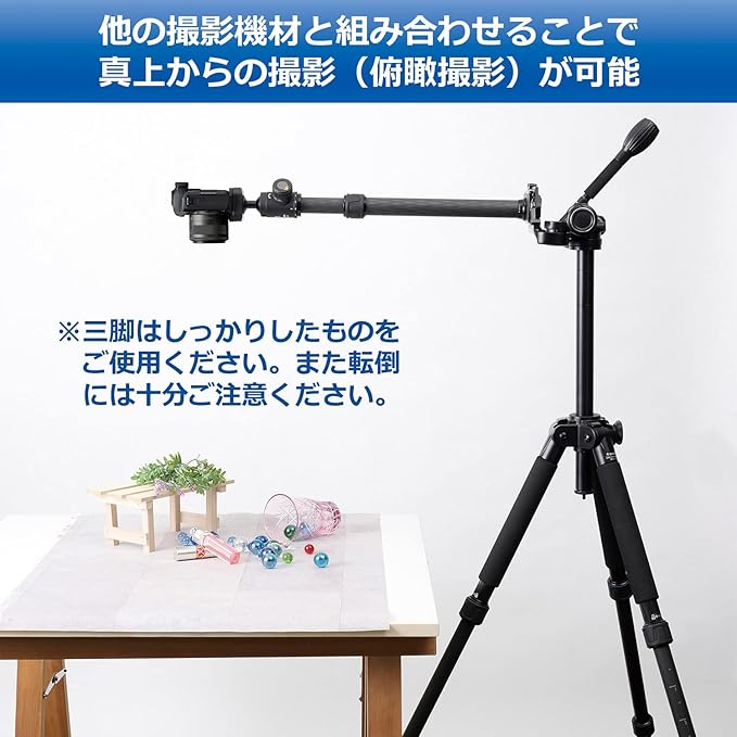 三脚や他の撮影機材と組み合わせることで、通常では撮りにくい「テーブル上を真上から撮る(俯瞰撮影)」ことが可能になります。