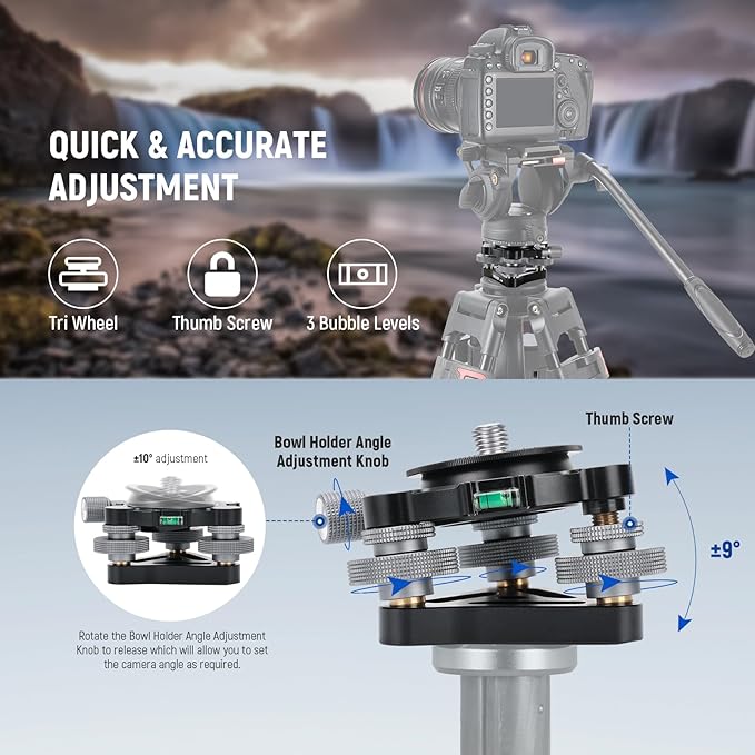 【ボウルアダプター付き三脚レベリングベース】三脚レベリングベースは、3本の短い支柱を備え、つまみネジで最大 9 の水平調整が可能です。さらに、ボウルアダプターが内蔵されているため、ひねるだけで+/-10 まで素早く水平を保ちます。気泡水準器が内蔵され、カメラの水平を一目で確認でき、常にまっすぐな状態を保つことができます。底部の3/8"ネジ穴は、三脚、一脚、スライダーなどに取り付けることができます。