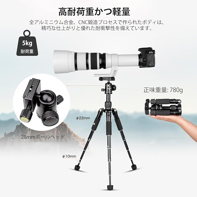 三脚は、高強度アルミニウム合金のフットチューブとクイックレッグロック設計、高度なCNC処理技術で作られています。 強くて安定しています。 5kgまでの負荷。