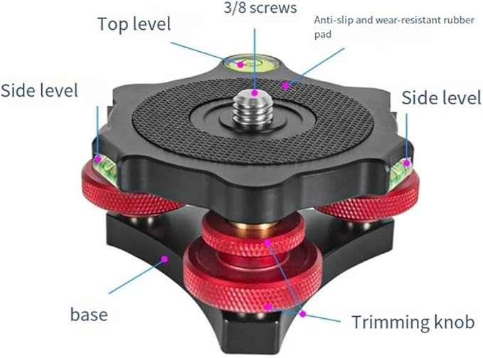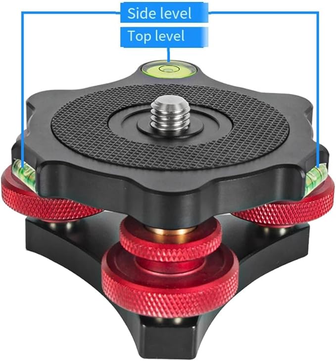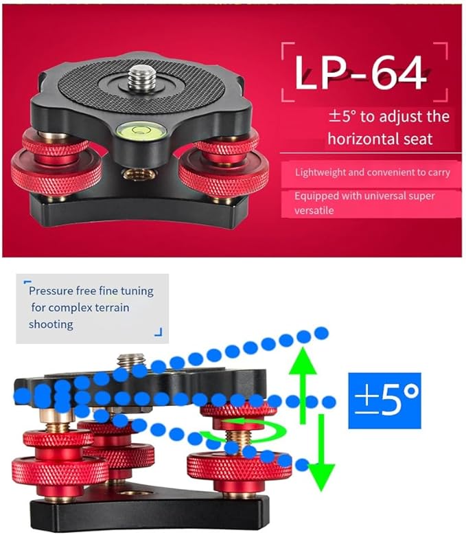 3 つの微調整ノブにより、水平方向に最大 +/- 5 度の調整が可能で、滑り止めの耐摩耗性ゴム製パッドとロック リング設計のダイヤルにより、カメラが完全に水平になり、安定した撮影が可能になります。