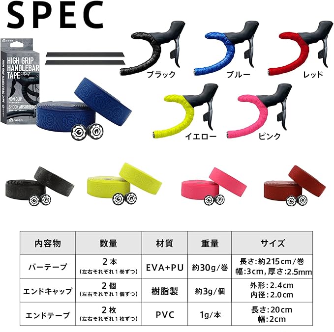 【商品内容】:バーテープ 2巻、エンドキャップ 2、エンドテープ 2 【カラー展開】本製品はロードバイクやクロスバイクに使用可能なバーテープです。カラーは黒、青、黄、赤、ピンクの5種類。 【仕様】耐水性、耐衝撃性に優れたEVA+PUレザーを採用。厚みは2.5mmなので地面からの振動を吸収し、伝わりにくくします。 【グリップ力】グリップ力の高いグリップテープなので、汗や雨で手が滑りにくい仕様になっております。また、水はけ性能を高めるデザインパターンを採用しているため、バーテープ表面に水分が残りづらいため、安定したグリップが得られます。 【衝撃吸収】適度なクッション性を持たせたバーテープは、ロングライドでも疲れにくい仕様となっております。 【樹脂エンドキャップ】樹脂製のエンドキャップを採用しているので工具が不要!ハンドルの先端から押し込むだけで装着完了 【巻き易い】柔らかく伸びやすいテープなので、R部なども伸ばしながら綺麗に巻くことが可能。 【注】ご使用のモニタ環境によって、実物と色味が異なって見えることが御座います。 【注】パワーライド重視や薄めのバーテープをお探しの方には向きません。