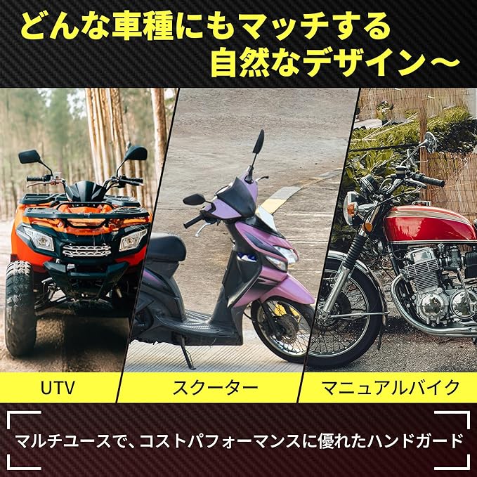 【汎用&簡単設置】 ナックルガードはほぼ全車種に対応可能です。洗練されたシンプルデザインがどんな車体にも調和し、専用取付部品がセットになっているため、工具が苦手な方でも手軽に組み立てられます。