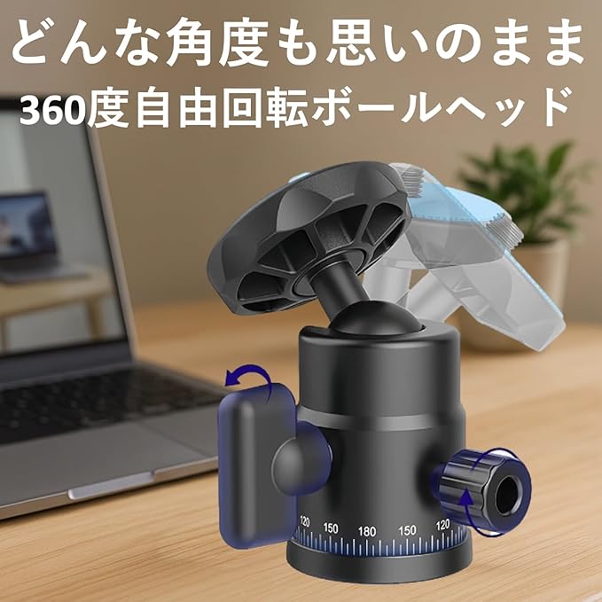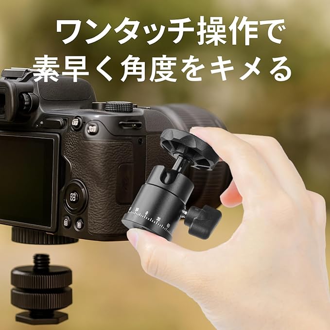 全方向に回転可能な360 回転機能を備え、上下・左右・斜めの角度調整でき、どんな角度からでも思い通りのアングルで撮影可能なボールヘッドです。撮影スタンドやミニ三脚との組み合わせにより風景撮影、パノラマ撮影、動画撮影など、自由雲台としてスムーズな操作を行うことが可能です。耐荷重2kgの高強度アルミ合金製で、DSLRカメラやミラーレス、一眼レフ、ビデオカメラをしっかり固定し、撮影中の揺れやブレを抑え、安定した撮影を行うことができます。屋外撮影や旅行時でも安心して使用できる頑丈な構造です。