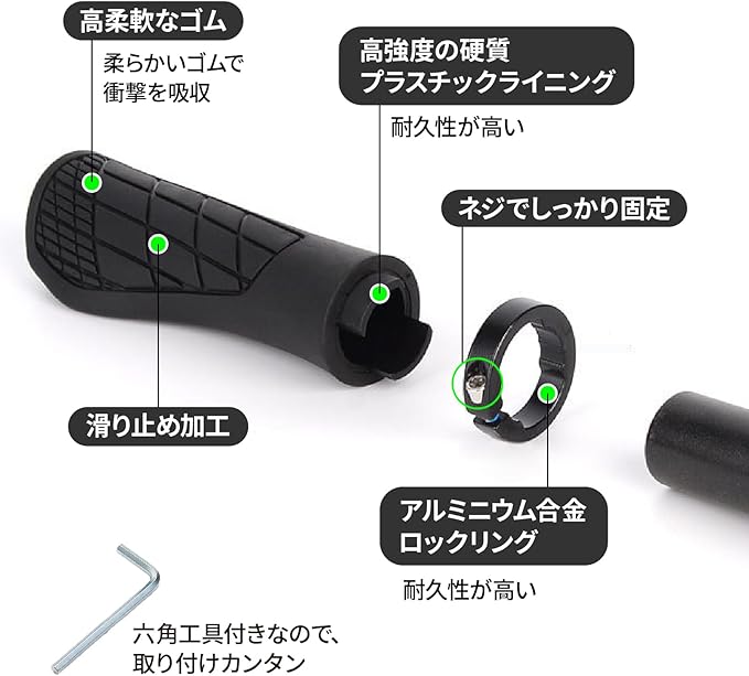【握りやすさ抜群】長時間握っていても手が痛くなりにくく、手のひらに吸い付くようなフィット感。快適なライディングを提供します。また、衝撃吸収素材を使用しているため、振動を吸収し、手の痺れを軽減します。
