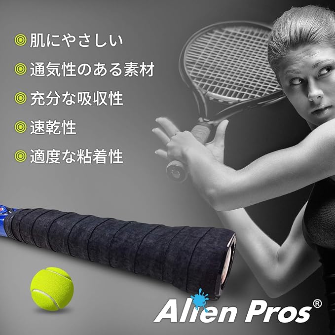 テニスプレイヤーによるテニスプレイヤーのための、吸水性抜群のドライタイプ。Alien Pros テニスグリップは、汗をしっかりと吸収し、滑らないようドライな感触を提供します。