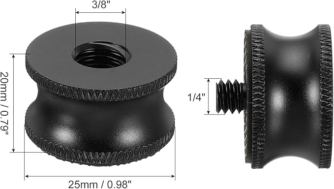 カラー:ブラック; 素材:アルミ合金; ねじサイズ:1/4オス - 3/8メス; ねじ長さ:5mm; 全体サイズ:25 x 20mm(D*H); パッケージコンテンツ:2 x カメラねじマウントアダプタ