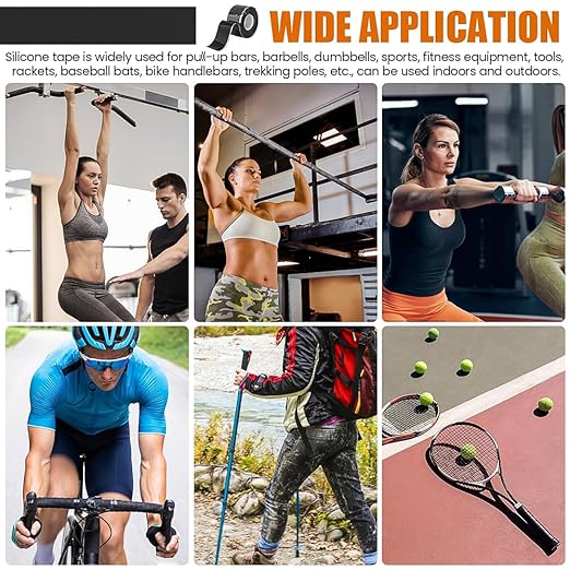 【幅広い用途】シリコンテープは、懸垂バー、バーベル、ダンベル、スポーツ、フィットネス機器、ツール、ラケット、野球バット、自転車のハンドルバー、トレッキングポールなどに広く使用されており、屋内でも屋外でも使用できます。