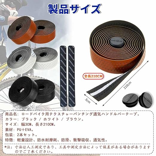 【製品仕様】 セット内容: バーテープ 2巻、専用エンドテープ 2本、バーエンドキャップ 2個 サイズ: 長さ2000mm 幅30mm 厚さ2.5mm 重量: 40g 素材: PU+EVA ※取扱説明書は付属しておりません。使用方法は商品ページの画像説明をご覧ください。