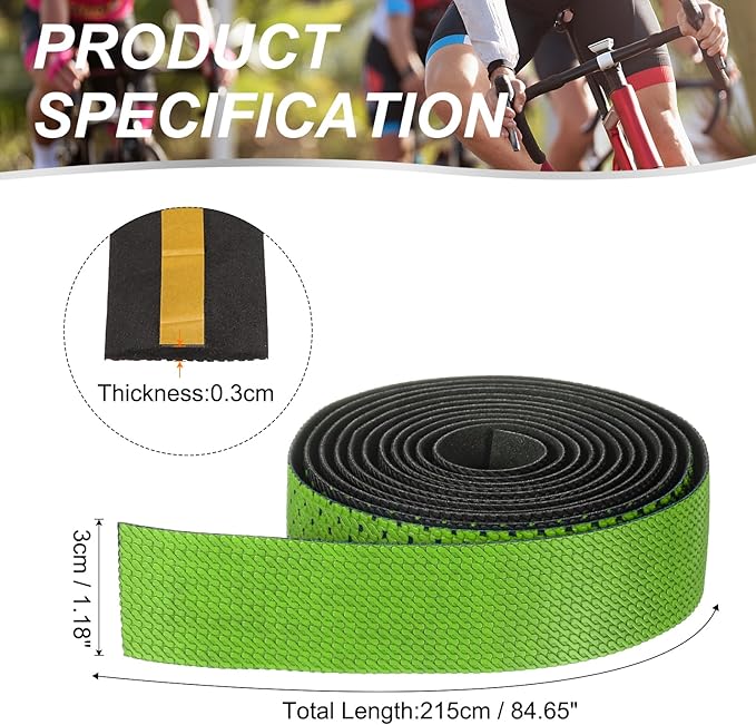 自転車ハンドルバーテープのサイズは215 x 3 x 0.3 cm / 84.65" x 1.18" x 0.12"(L*W*T)、カラーは緑です。