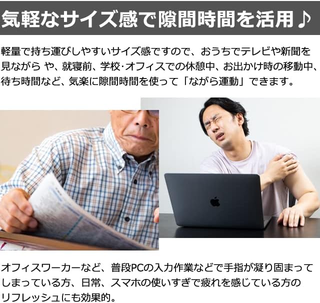 丸い形状と、適度な弾力性、ソフトな感触、すべすべの手触りが気持ち良く、癒されます!ハンドグリップ初心者の方にも使いやすく、普段のストレス解消にも◎目立つ蛍光カラーで視認性が高く、暗いところに置いたりカバンに入れても探しやすいので安心。カラーセラピー効果として明るい気分にも♪握って開いて気軽にストレッチ!指固定のテープ部分は6箇所あり、左右兼用で使えます。軽量で持ち運びしやすいサイズ感ですので、おうちでテレビや新聞を見ながらや、就寝前、学校・オフィスでの休憩中、お出かけ時の移動中、待ち時間など、気楽に隙間時間を使って「ながら運動」できます。オフィスワーカーなど、普段PCの入力作業などで手指が凝り固まってしまっている方、日常、スマホの使いすぎで疲れを感じている方のリフレッシュにも効果的。※片手用で、単品1個の販売です。