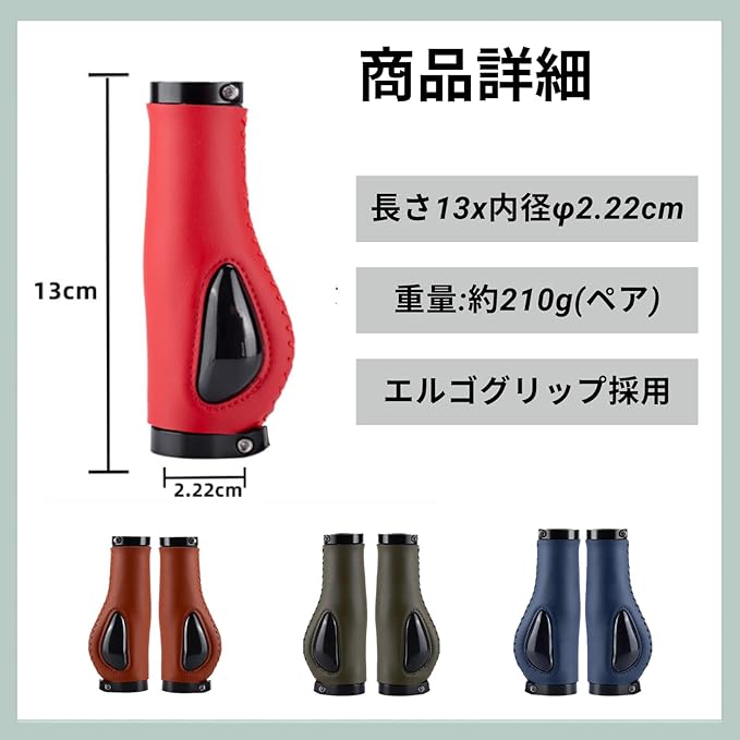 【商品詳細】サイズ:長さ13x内径φ2.22cm、 重量:約210g(ペア、 素材:マイクロファイバー、シリコンクッション、アルミ合金リング、 内径φ22.2mm用(自転車クロスバイクママチャリ等様々なタイプに対応。※購入前に内径をご確認の上ご購入下さい)、 カラーバリエーション:ブラック、ブルー、オリーブ、ブラウン