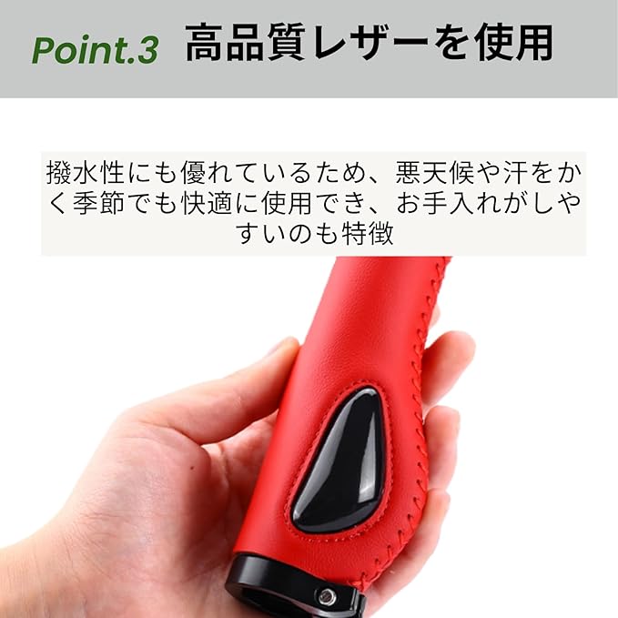 【自転車用グリップ】エルゴグリップデザインを採用した自転車グリップです。従来の丸いグリップとは違い、手のひらに当たる部分が平らに設計されているのが最大の特徴です。接触面積を大幅に拡大しことにより、圧力が一点に集中するのを防ぎます。さらに負荷がかかりやすい部分に弾力性の液体シリコンクッションパッドを配置し、手首への負担も軽減してくれます。【簡単取り付け】アルミ合金製のダブルロックオン機構を採用しており、両サイドからネジでしっかりと固定することで、グリップのゆるみを強力に防止します。しっかりとした固定力が特徴でありながら、取り付け・着脱は非常に簡単で、初心者の方でも手間なく交換できます。【高品質レザー】本体のギリップ部分には高品質PUレザーを使用。スタイリッシュなデザインで、見た目だけでなく、心地よい握りやすさと耐久性を兼ね備えています。撥水性にも優れているため、悪天候や汗をかく季節でも快適に使用でき、お手入れがしやすいのも特徴です。