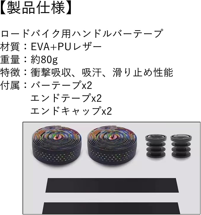 商品内容:バーテープ 2本、エンドキャップ 2個、エンドテープ 2枚 寸法:長さ2150mm 幅30mm 厚み3.0mm 重量:80g 材質:EVA+PU