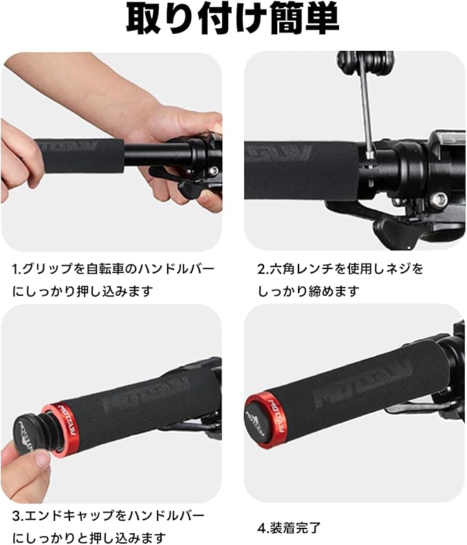 【取り付け簡単】自転車グリップはハンドルに直接差し込んで、ハンドルの端のボルトを3mm六角レンチで締め付けてください、エンドキャップを入れて取り付け完了します。ボルトで固定するタイプのため、初心者でも簡単に取り付け簡単できます。