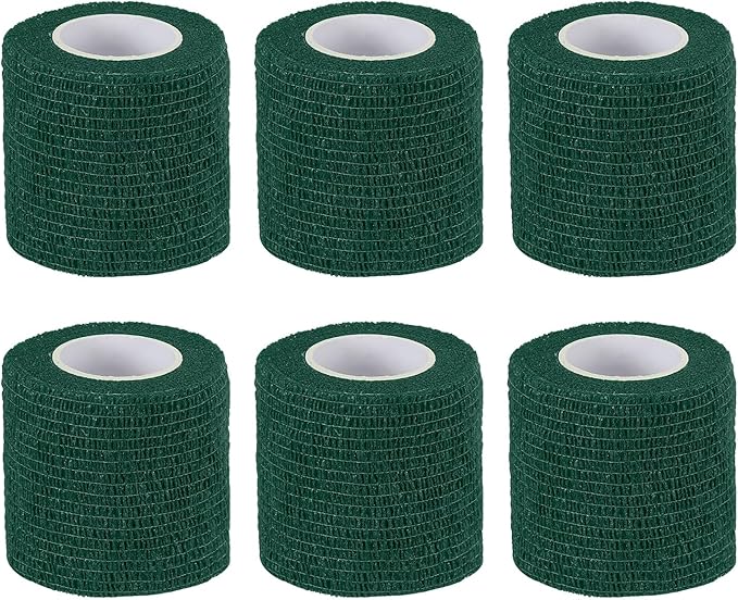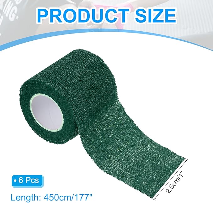 カラー:ダーク緑;素材:不織布;長さ:177"(450 cm);幅:1"(2.5 cm);梱包リスト:自己粘着性包帯巻き6個