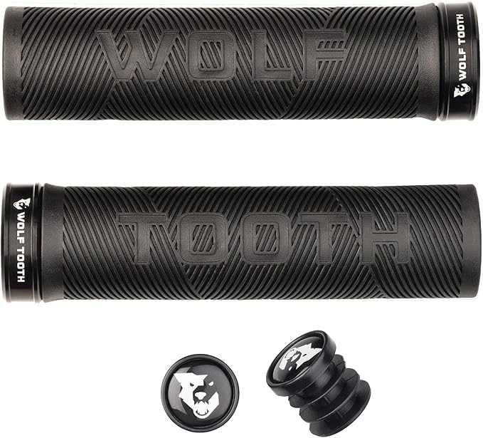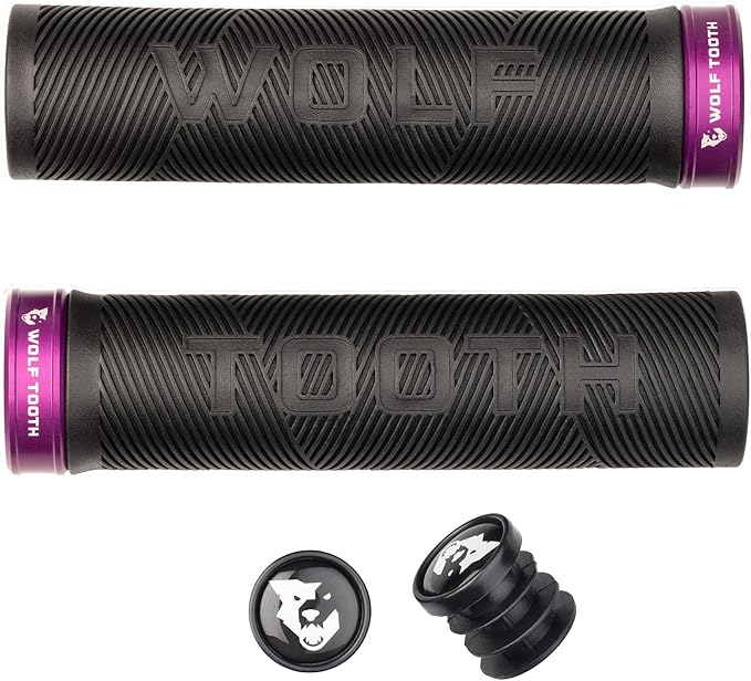 商品名: Wolf Tooth Components Echo Lock-on Grips Wolf Tooth Echo Lock-On Gripsは、どんな形態のマウンテンバイクにも対応したグリップです。 ゴム素材は柔らかくて粘着性があり、グリップの対角線状のパターンは、手袋をしていてもどんな状況でもライダーの手をしっかりと固定します。 グリップは、堅牢なプラスチックライナーに黒色の20A硬度のラバーを使用し、アルマイト処理されたアルミニウムカラーを付属しており、他のWolf Toothのアルマイトアクセント部品とマッチする8つの主要なカラーで展開しています。 長さは132mmで、直径は32mmです。 標準の22.2mmマウンテンバイクハンドルバーに対応しています。 コラールの取り付けは3mm六角レンチで締め緩めが可能です。 バーエンドプラグが付属しています。
