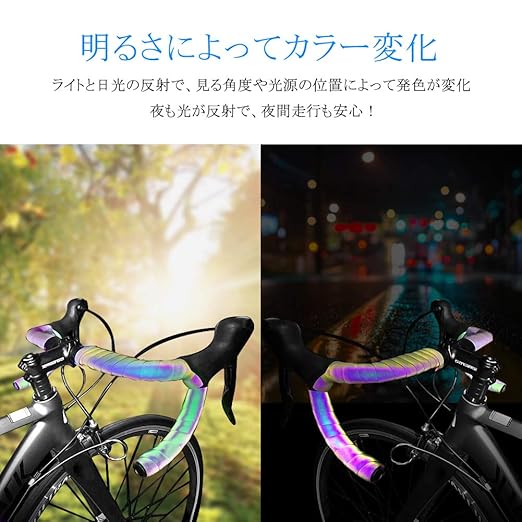 【変色バーテープ】ライトと日光の反射で、見る角度や光源の位置によって発色が変化できます。暗がりで光の当たり方で反射する様に輝くのが魅力があります。日光や夜間の車のライト等に反射して走行も安心です。