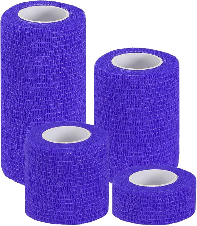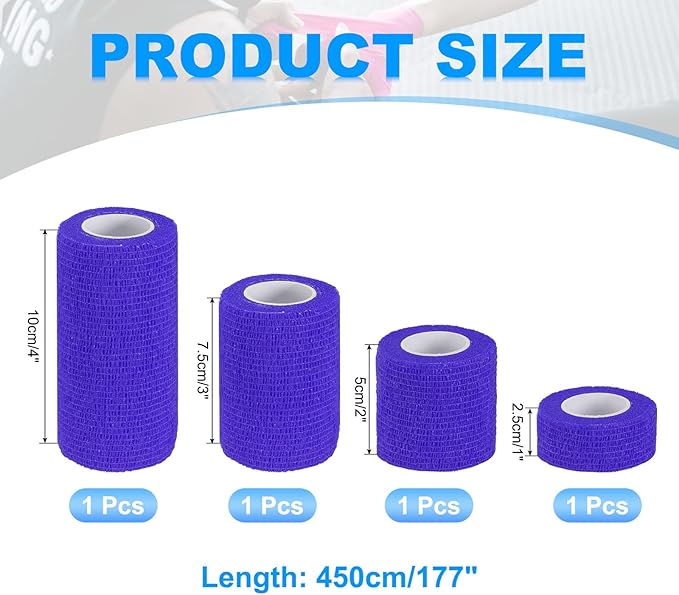 カラー:ダークブルー;素材:不織布;長さ:177"(450 cm);4つの幅:1"(2.5 cm)、2"(5 cm)、3"(7.5 cm)、4"(10 cm);梱包リスト:セルフアドヘーシブバンデージラップ4個(仕様ごとに1個)