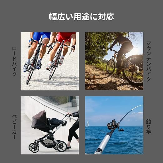 ロードバイクはもちろん、マウンテンバイク、ベビーカー、釣り竿など、幅広い用途に対応。愛車のカスタマイズ性が高く、選ぶカラーで個性を際立たせることができます。