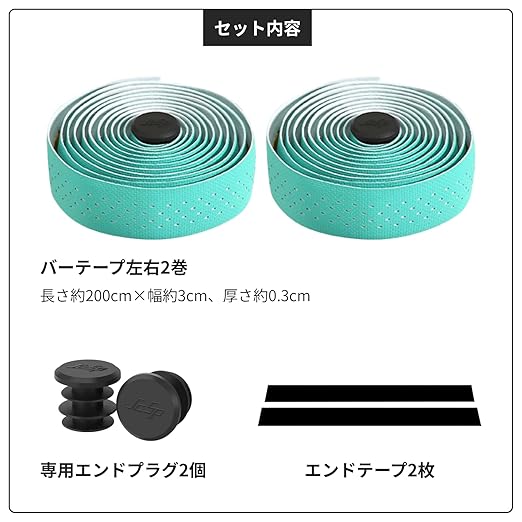 バーテープ左右2巻(長さ約200cm 幅約3cm、厚さ約0.3cm)、専用エンドプラグ2個、エンドテープ2枚が含まれます。