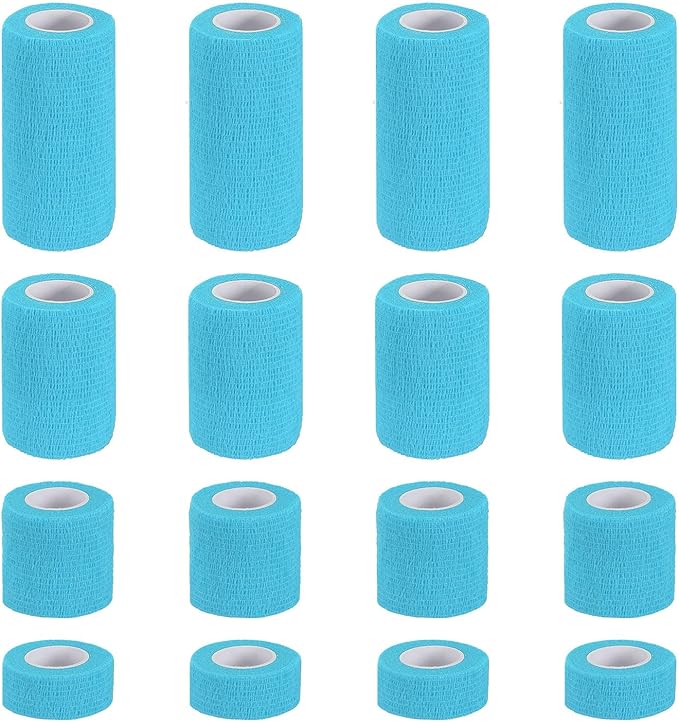 カラー:スカイブルー;素材:不織布;長さ:177"(450 cm);4つの幅:1"(2.5 cm)、2"(5 cm)、3"(7.5 cm)、4"(10 cm);梱包リスト:16個 x セルフアドヘーシブバンデージラップ(1個ごとの仕様)