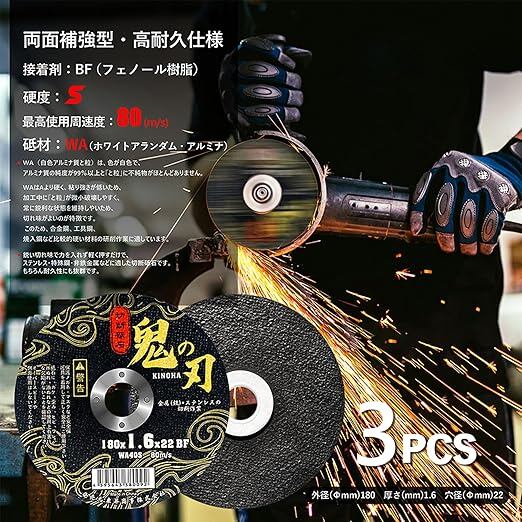 (鬼の刃)KINOHA切断砥石(180mmφ・3枚入)金属用 鉄工用 替刃 替え刃 ディスクグラインダー対応 アクセサリー180 1.6 22㎜