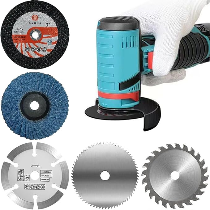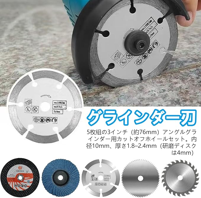 【セット内容】:5枚組の3インチ(約76mm)アングルグラインダー用カットオフホイールセット。内径10mm、厚さ1.8–2.4mm(研磨ディスクは4mm)。金属、木材、タイル、プラスチックなど様々な素材に対応。イラスト付きで用途別に使い分け可能。
