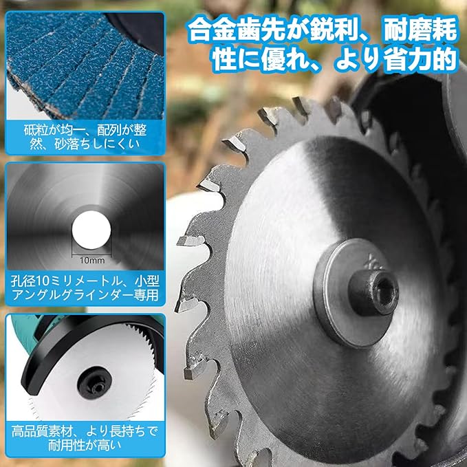 【コストパフォーマンス】:5枚の異なるタイプの刃がセットに。金属切断、木工切削、石材加工、研磨まで、これ一本で必要な作業を網羅。