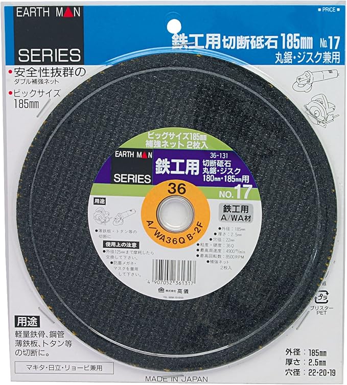 ●外径:185 ●厚さ:2.5 ●穴径:22/20/19 ●砥材:A/WA材 ●粒度・硬度:36Q ●最高周速度:81.7[4900] ●最高回転数:8500