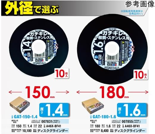●砥材:A●粒度(#):46●硬度:X●外径(mm):180●刃厚(mm):1.6●穴径(mm):22●最高使用回転数(rpm):8400●最高使用周速度(m/s):80