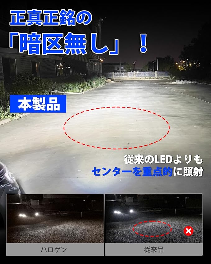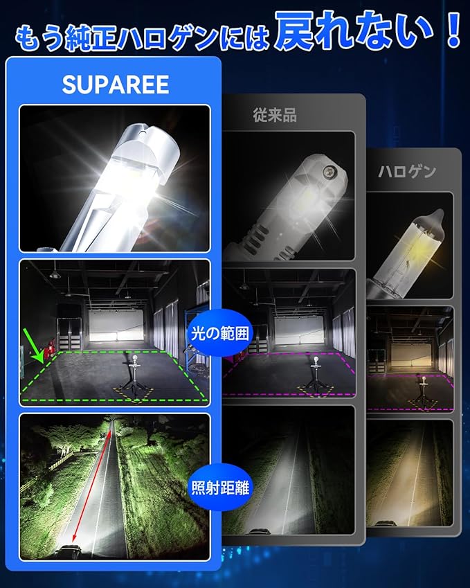 【センターまで照らす H8 LED】純正ハロゲンは暗くて運転中に不安を感じる…市販のLEDバルブに交換しても、通常の二面発光設計では、光が届かない暗区ができてしまうという悩みがありますか?SUPAREEの新開発した三面発光h11 led ヘッドライトが、従来LEDよりも中心を重点的に照らす配光で、暗部を解消し、遠くまでしっかり届き、夜間の運転をサポートします!超高輝度3570CSPチップを三面搭載、純正ハロゲンに比べて圧倒的な明るさと光量を実現します!明るく、クリアな視界が長距離運転時の目の疲れを軽減します