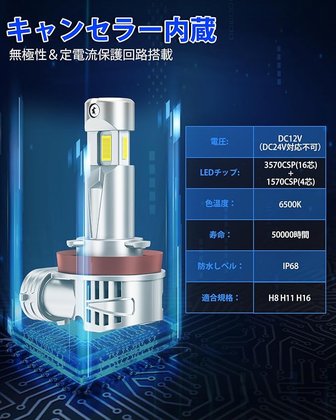 【IP68防水&視認性抜群】弊社の h11 led ヘッドライト は 雨・湿気・ホコリなど外部環境に強い設計で、さまざまな走行シーンに対応。視認性に優れた純白色(6500K)を採用し、雨の日でも路面をクリアに照らす高輝度を実現します。この目に優しい色調は、長時間運転時の目の疲労軽減にも効果的です!h16 led ヘッドライト IP68の防水防塵レベルで、低温&高温の運行環境でも瞬時点灯が可能、お客様の快適運転をお守りします