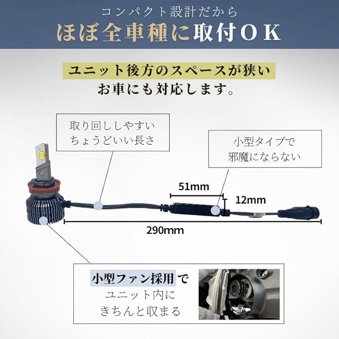 【本製品のご注意点】・バルブアダプターが必要な車種へのお取り付けはできません。・極性がございますので、点灯しない場合は逆向きにお差し込みください。・フィン部分は高温になりますため、配線やタイラップが接触しないよう、また排熱・ファン干渉にご注意ください。・純正ヒューズが15A未満の場合、15Aヒューズへの交換または別売リレーハーネスのご使用を推奨いたします。ヒューズ切れの恐れがございます。・H1、H3など、裏蓋防水カバーの加工が必要な場合がございます。・ライムイエローは車検基準内ですが、検査官の判断により非対応となる場合もございます。・防水ゴムは稀に破損することがございます。その際は付属の予備ゴムに交換してください(ご購入時期によっては付属しない場合もございます)。・輸入車では、球切れ警告灯の回避やヒューズ切れ防止のため、別売リレーハーネスやキャンセラーが必要な場合がございます。エンジン始動時等の一時点滅は車両仕様によるものです。