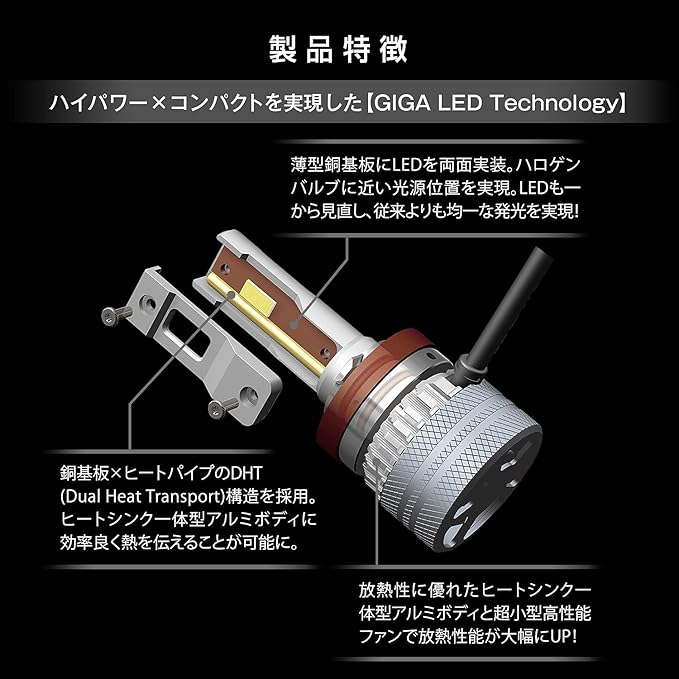 全光束7000lm(2灯合計)と、見やすさを追求した5000Kの白色光により、今までにない「明るさと見やすさ」を実現しました。銅基板 ヒートパイプのDHT構造を採用。ヒートシンク一体型アルミボディに効率良く熱を伝え、小型高性能ファンで一気に放熱することで長時間安定した明るさを実現しています。