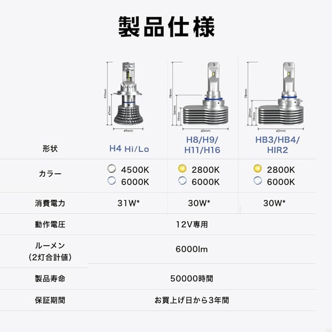 【製品仕様】商品名:RIZING3(ライジング3)、形状:H8/H9/H11/H16、明るさ:6000lm、カラー:6000K(ホワイト)、対応電圧:DC12V、消費電力:30W、入り数:2本、保証:お買い上げより3年間