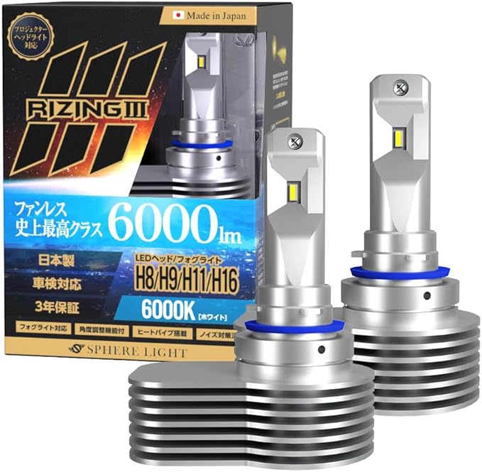 スフィアライト RIZING3 H8 H9 H11 H16 LED ヘッドライト 6000K ホワイト 6000lm 車検対応 日本製 バルブ ファンレス ノイズ対策済 防水 防塵 ライジング3 SPHERELIGHT SLRZH11060