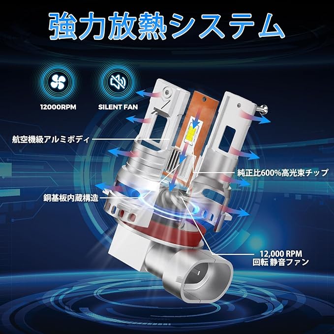 【優れた放熱性能&長寿命】改良されたマルチ冷却構造を採用。LED H11ランプ本体は航空機用アルミニウム製で、内蔵の銅板ベースがより広い放熱面積を提供します。15,000rpmの高速度冷却ファンと複数の独自の放熱孔設計により、冷却速度を加速し、長期的な使用寿命を保証します。